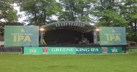 This is our MR1 stage roof complete in this picture with customised PA scrims for the main sponsor. This is our medium sized roof, at 10m W x 8m D.